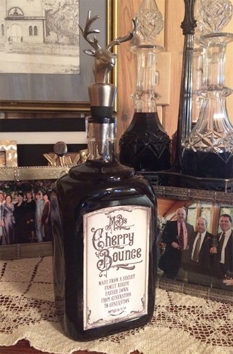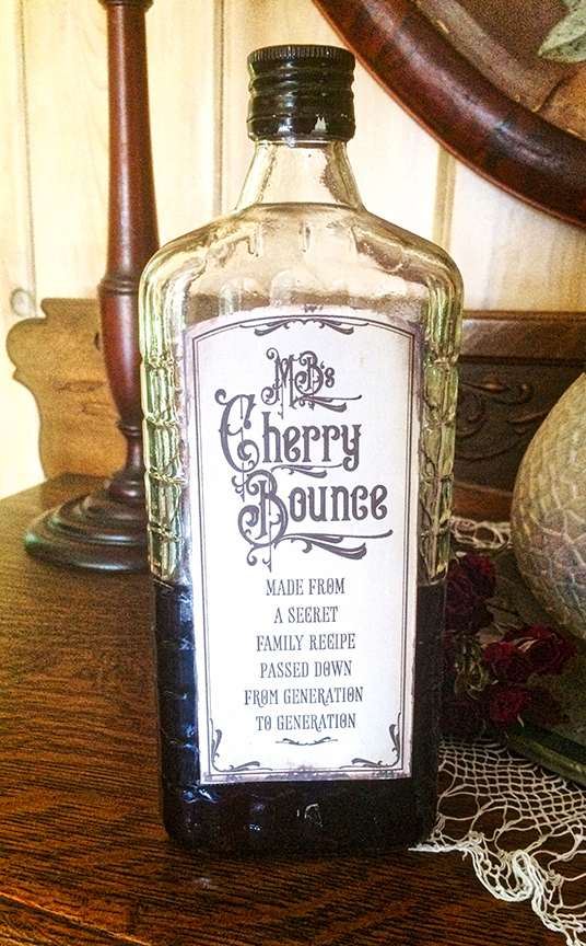 The label says it is “MB’s Cherry Bounce” made from a secret family recipe handed down from generation to generation—all lies—well, mostly lies. MB did inspire this, but since I could not find his original recipe, I had to experiment. And the recipe isn’t really secret. It is attached below for anyone who wants to make a batch of their own.
