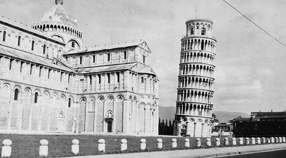 “8 Sept – Visited Pisa. It’s a ghost town. Not a civilian there. In fact, the town is hardly there … Only section not ruined is that around the tower … It too has the scars of battle. Cathedral of Santa Maria Majore beautiful. Built in 1063.”